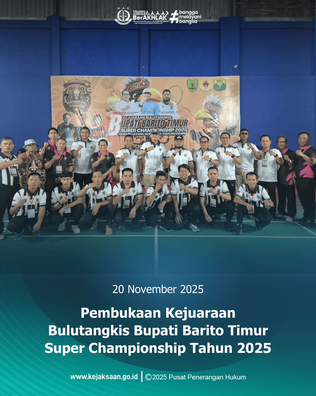 Kamis, 20 November 2025 – Kepala Kejaksaan Negeri Barito Timur menghadiri pembukaan Turnamen Bulutangkis Bupati Barito Timur Super Championship Tahun 2025 yang dibuka secara resmi oleh Bupati Barito Timur. Kegiatan ini menjadi ajang kebersamaan yang mempererat tali silaturahmi antar masyarakat, sekaligus wadah positif bagi generasi muda untuk menyalurkan bakat dan semangat sportivitas di bidang olahraga.